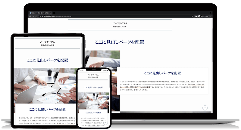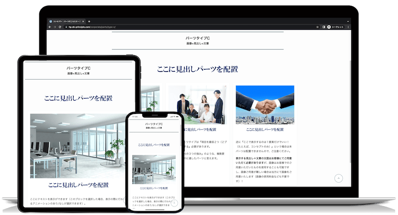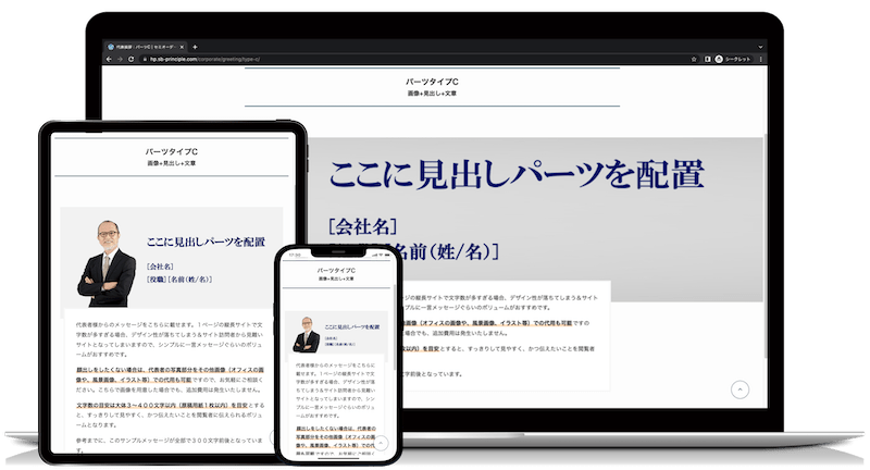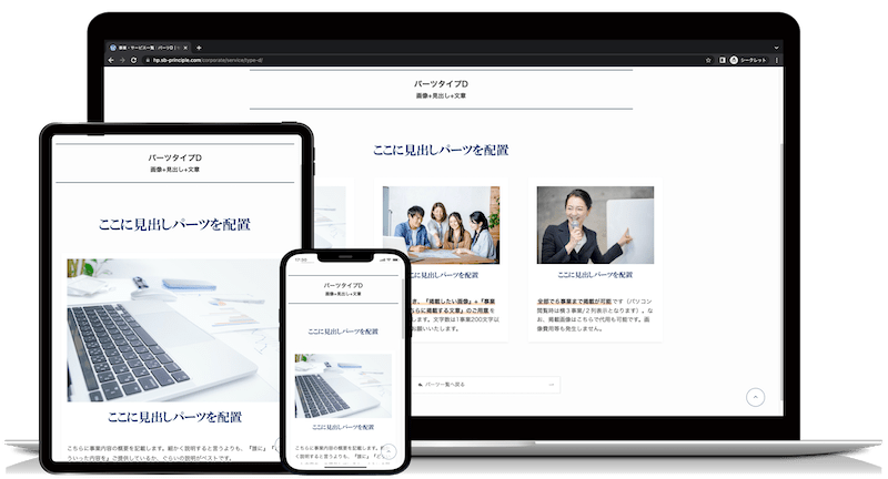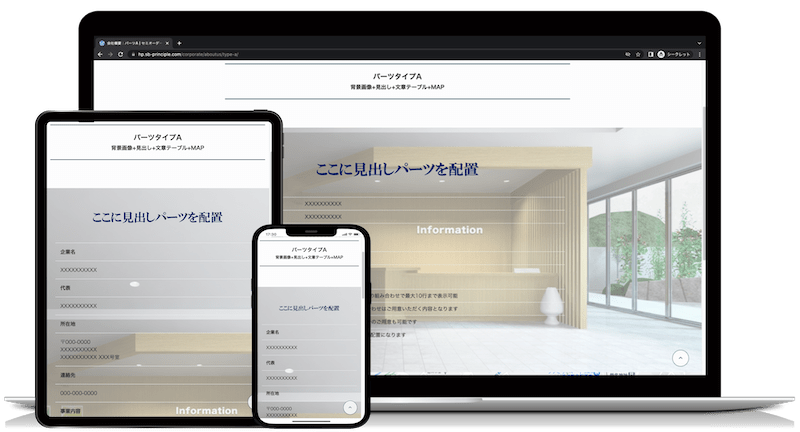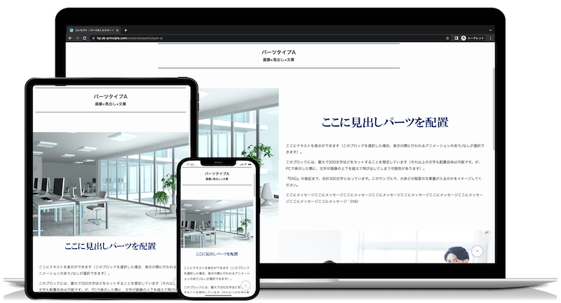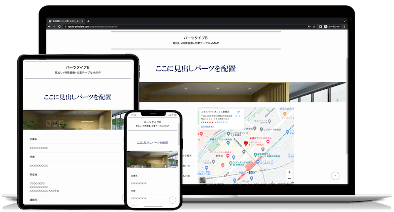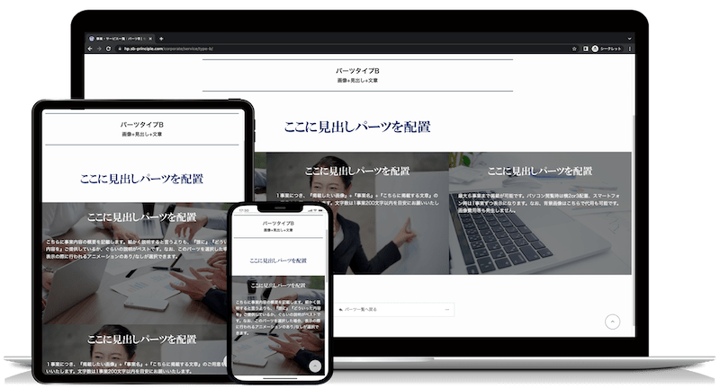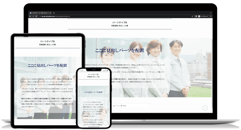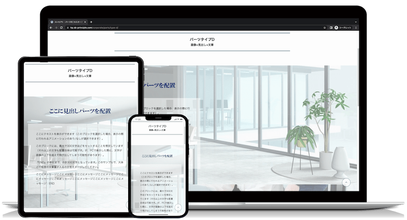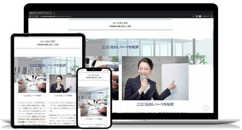 サイトを開いとき、一番最初に表示される部分のパーツです(タブレット/スマートフォンでの表示は、どのタイプも同じデザインとなります)