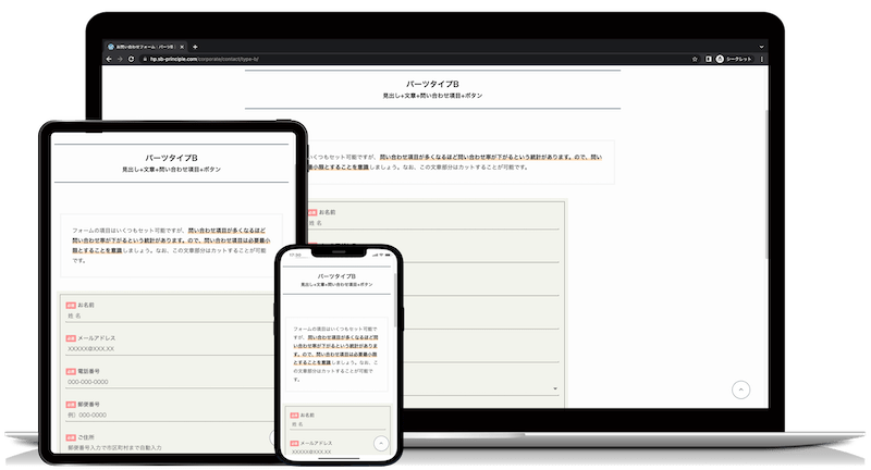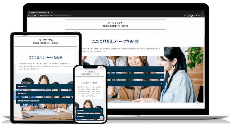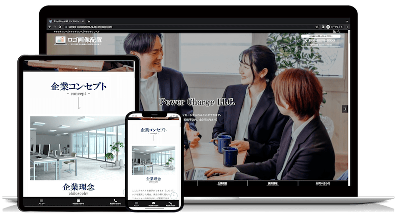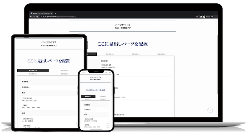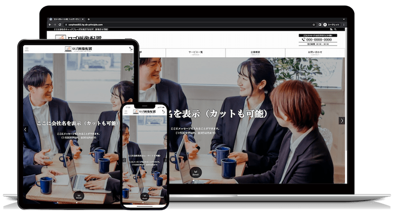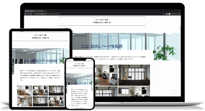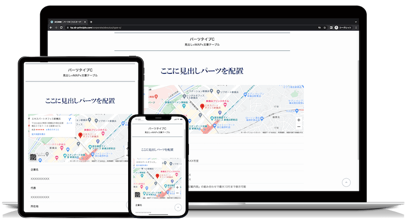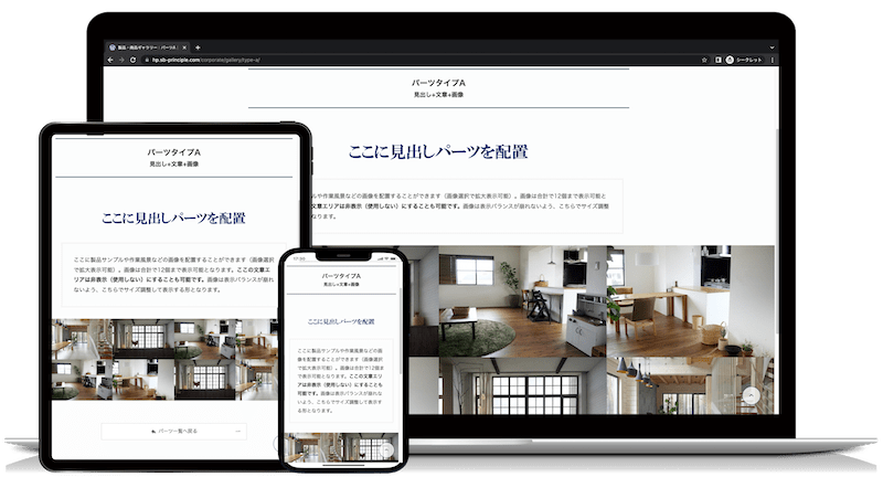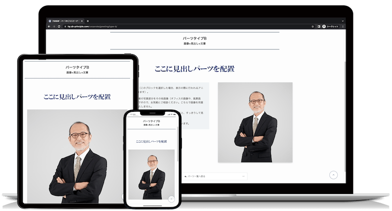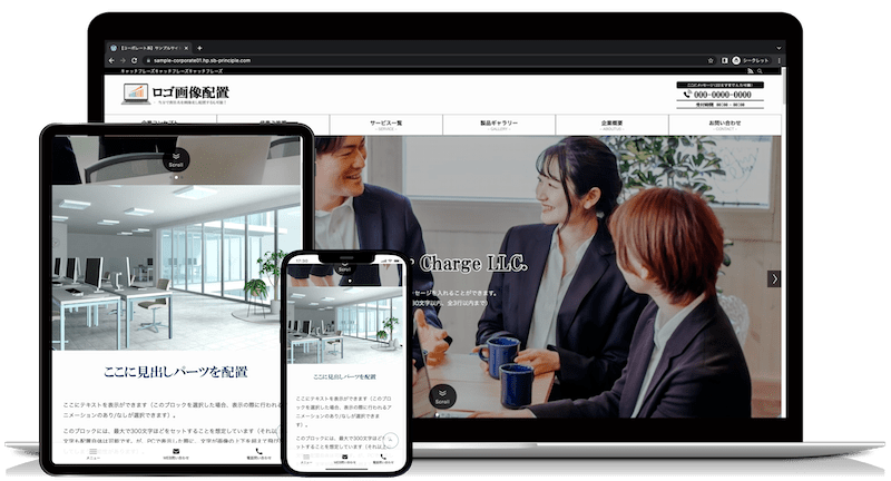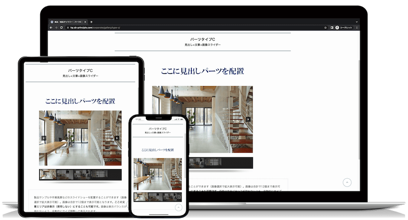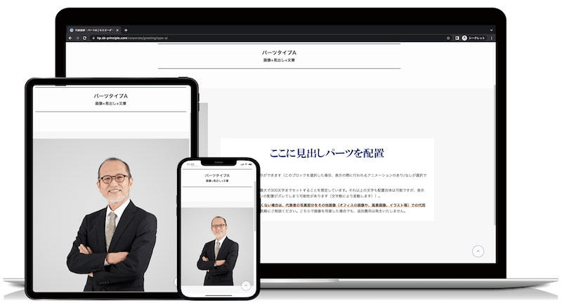 サイトを開いとき、一番最初に表示される部分のパーツです(タブレット/スマートフォンでの表示は、どのタイプも同じデザインとなります)